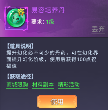 提升幻化必不可少的丹药,可在幻化界面提升幻化阶级,使用后获得100点祝福值;