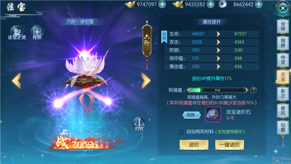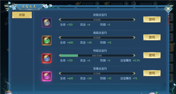 通过界面的法宝按钮,点击一下就能打开法宝界面了,在界面中可以看到属性加成数值。培养法宝进阶可以大幅提升这些属性值,以及解锁更多技能或更绚丽的外观。