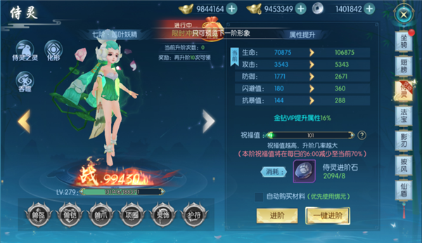 其一:通过“侍灵进阶石”进行进阶,祝福值越高升阶几率越大,“侍灵进阶石”可以通过侍灵副本、商城、BOSS等方式获得。