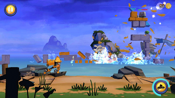 我们主要会遇到的障碍物是坍塌的高塔。当变形金刚跑到这个位置时,高塔便会坍塌。以变形金刚正常的跑酷速度,根本无法避免。此时,只需点击屏幕右下角的汽车标志,汽车人就会变身为飞驰的汽车,迅速躲过高塔。