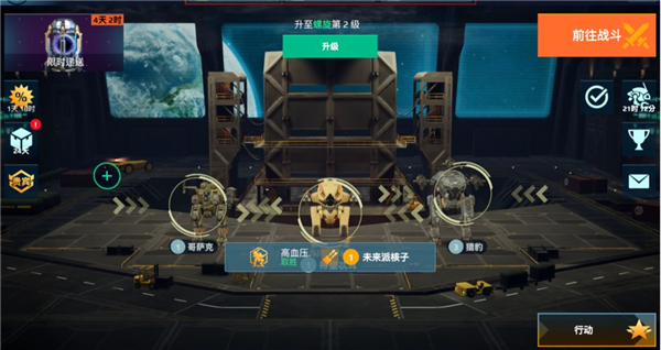 占据主界面C位的是现有并出战状态下的机甲,指挥官可以点击机甲进入机库,进行更换、升级以及替换装备等操作。