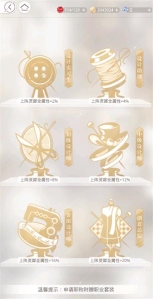 3在不提升卡牌等级的前提下,提升基础战力是关键。基础战力的提升主要围绕三个维度展开:设计师等级、默契点以及六项属性的升级。设计师等级目前共有六个阶段,每次提升不仅能增强上阵时的属性加成,还会解锁专属服饰奖励。设计师等级的提升与六项属性的强化,需要通过“研究之旅”获取所需资源,或是在商店中兑换设计证明与对应属性的升级材料。“研究之旅”包含十个大关卡,每个大关卡下又细分12至20个不同难度的小关卡,通关这些关卡可获得心意币与经验值奖励。