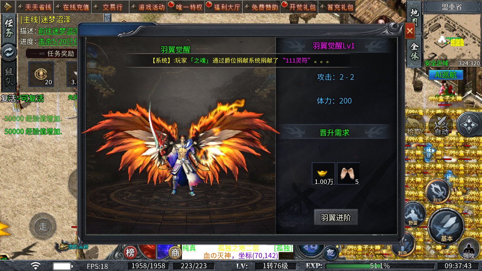 2、羽翼觉醒:消耗羽翼魂魄与元宝就能完成晋升,每提升一级都会增加攻击属性和体力值。