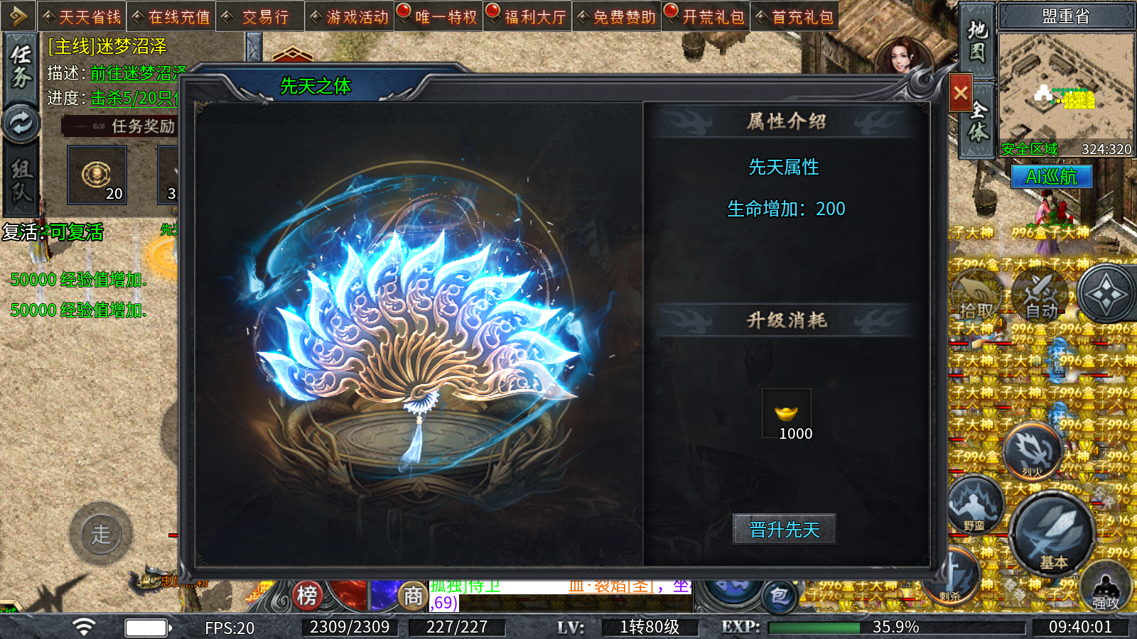 5、先天体质:花费元宝即可进行提升,每次提升都能显著增加体力值。