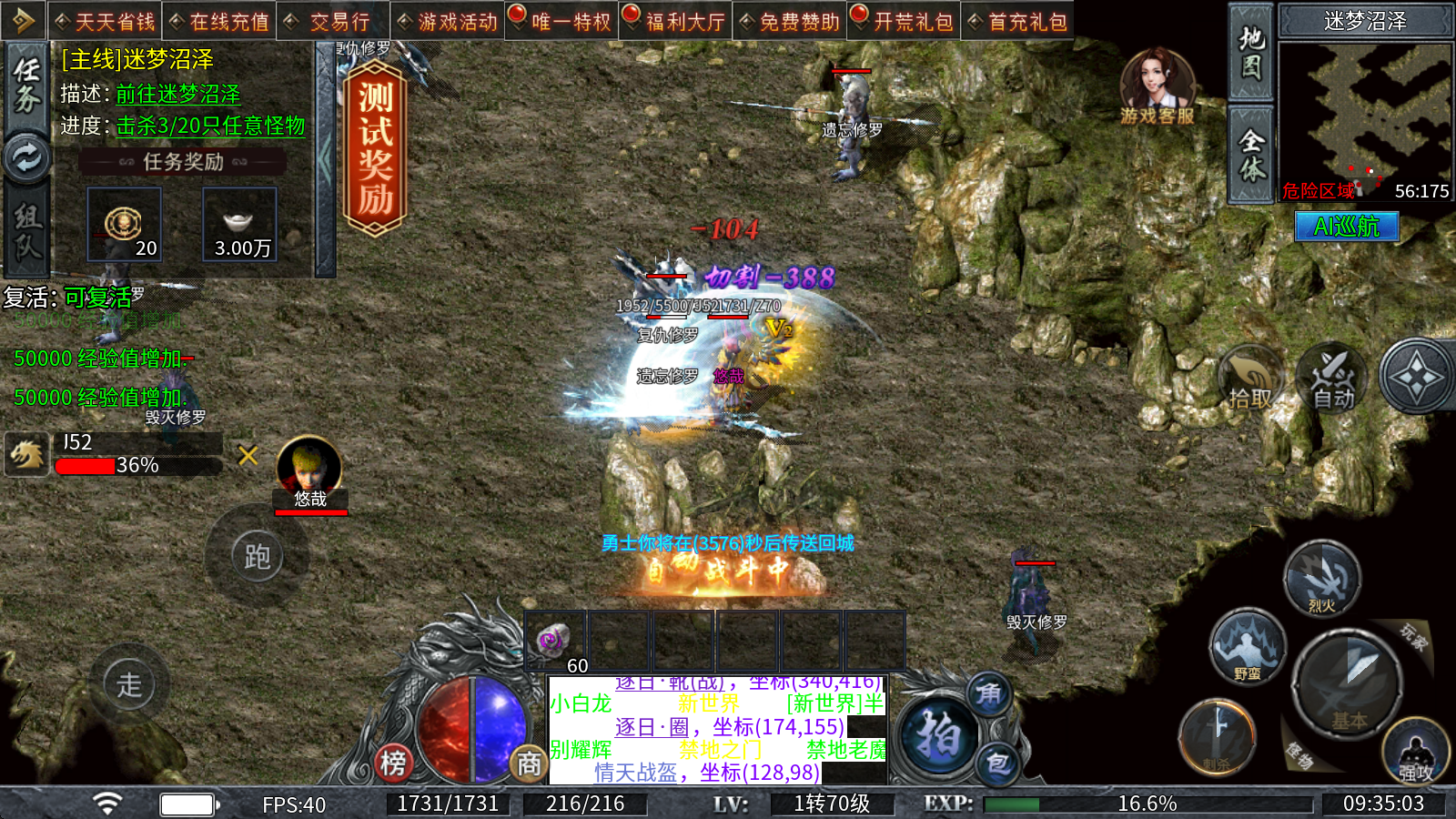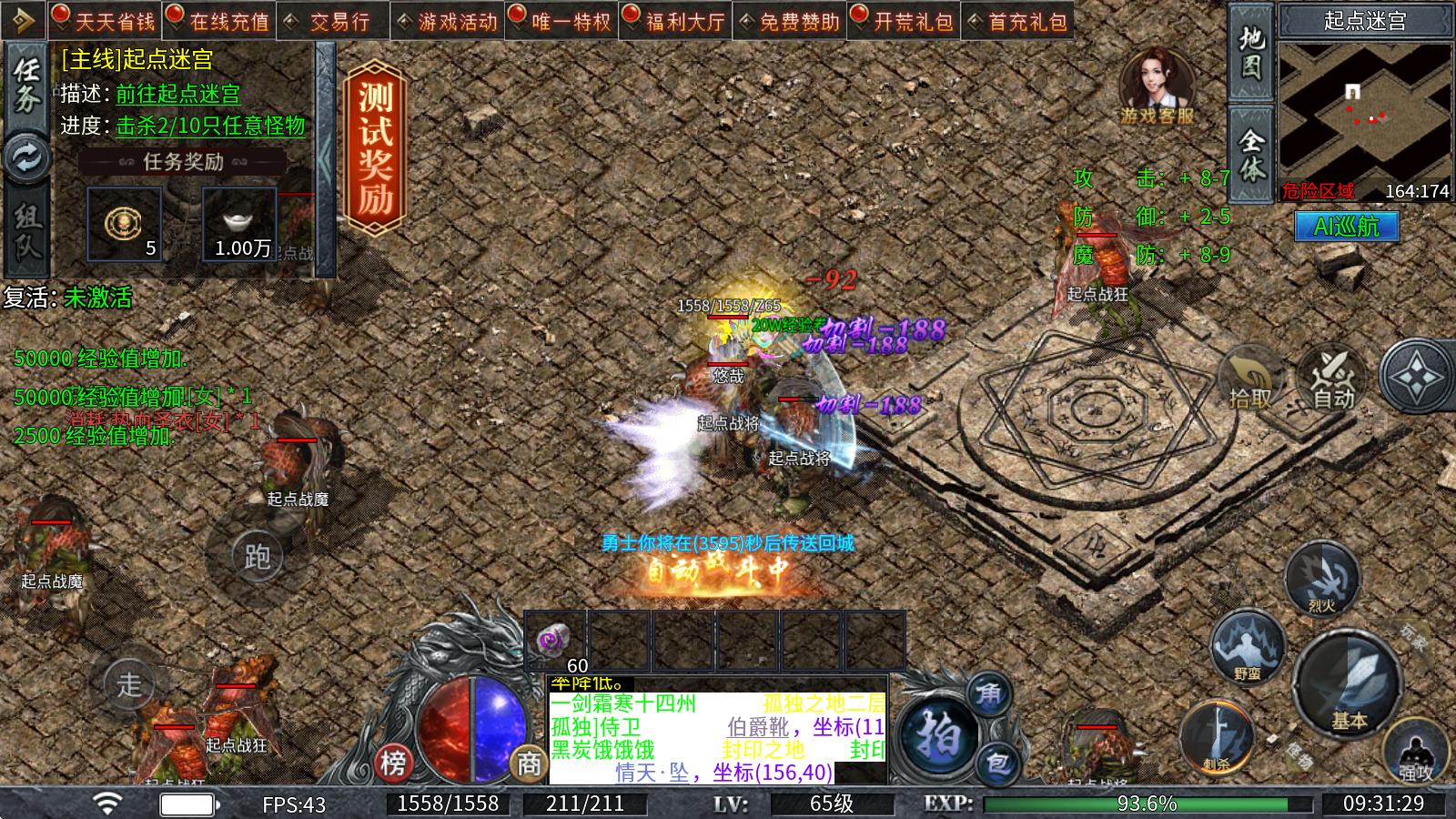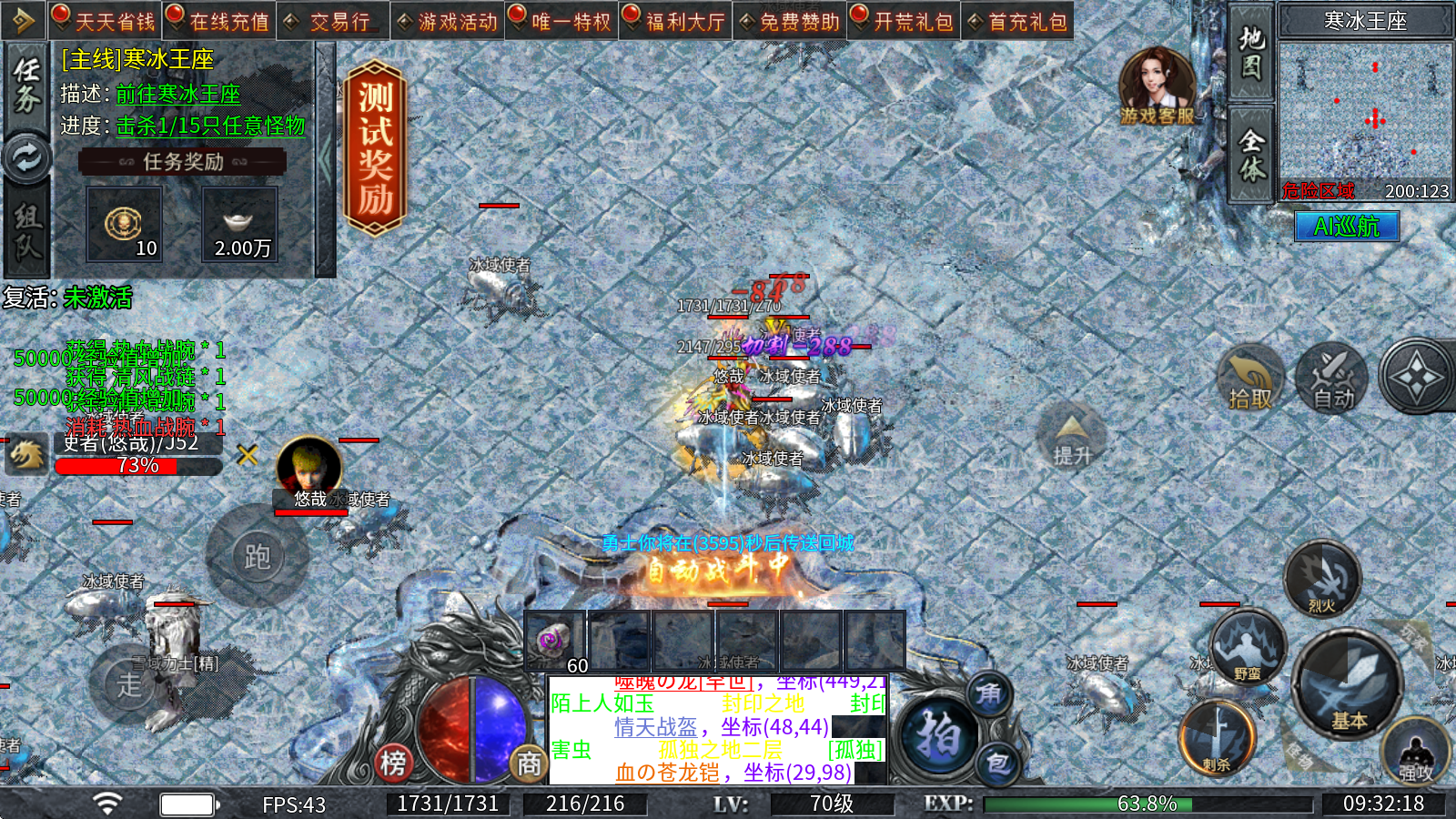1、激情泡点、幸运活动、狂暴活动、怪物屠城等精彩活动持续开展,玩法热血刺激,奖励也极为丰厚。