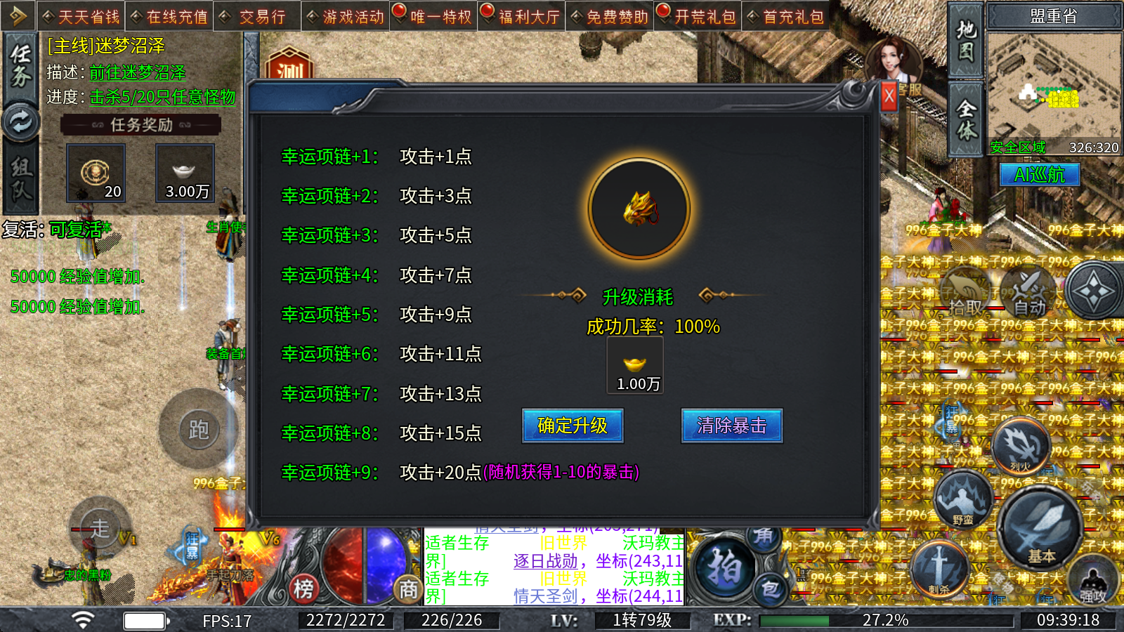 4、幸运项链:消耗元宝就能升级,等级越高,升级成功率越低,而且+9之后能随机得到1-10的暴击属性。