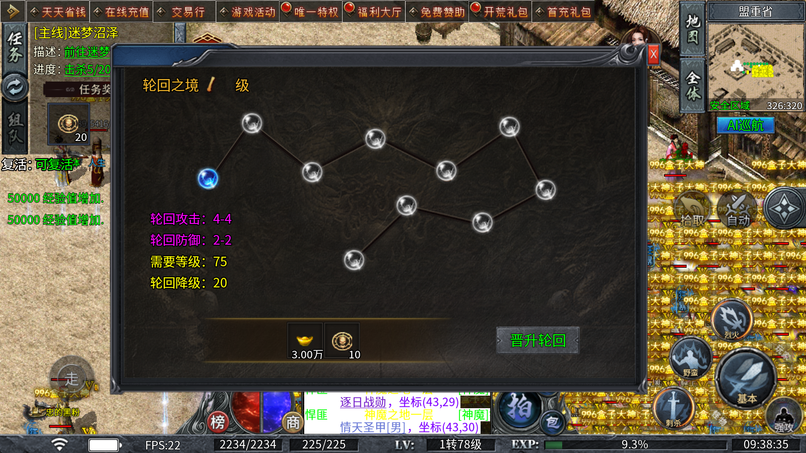 3、轮回之境:通过消耗轮回之晶与元宝来提升等级,每提升一级轮回,角色等级会降低20级,同时可获得轮回攻击和轮回防御属性。