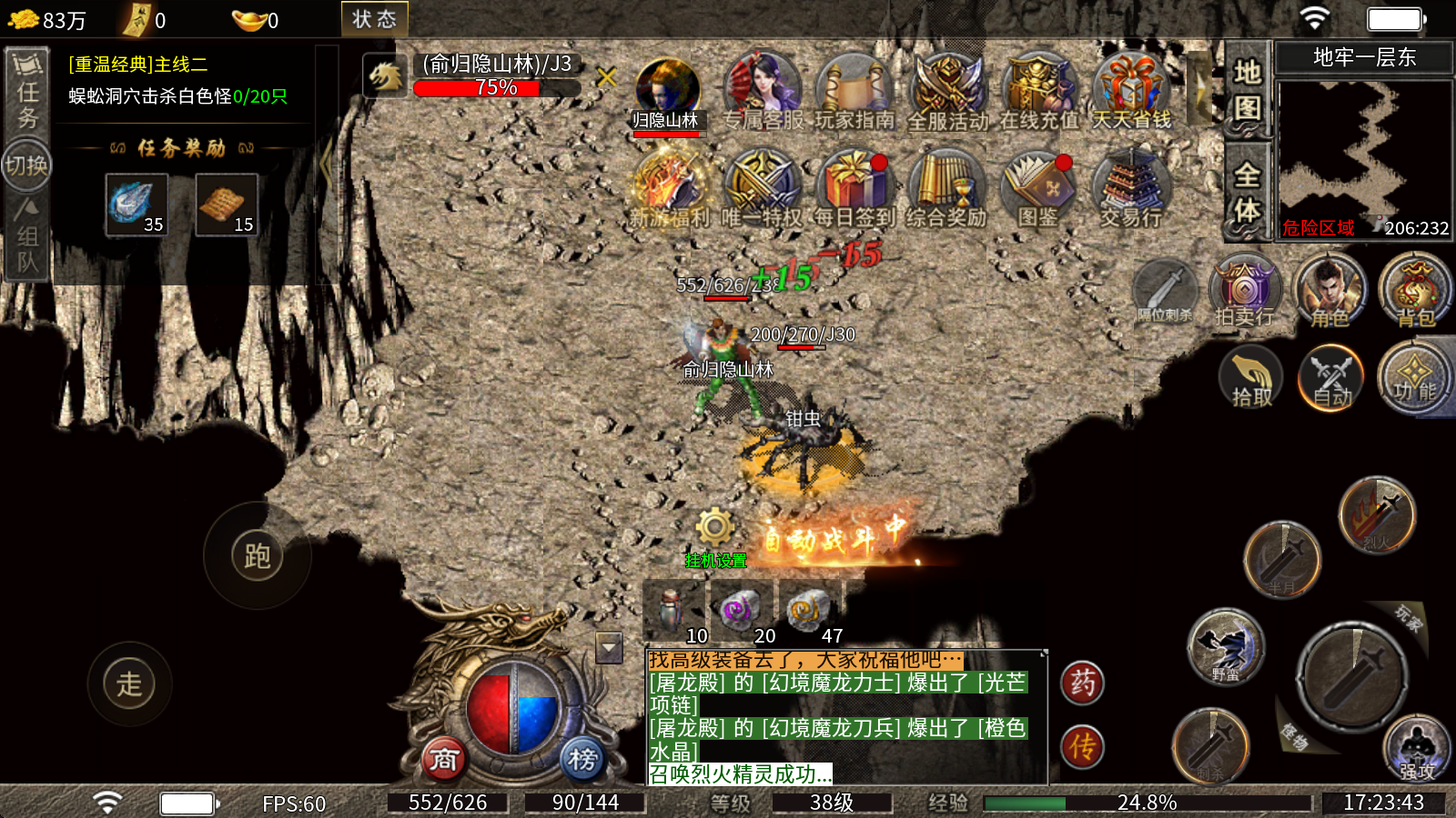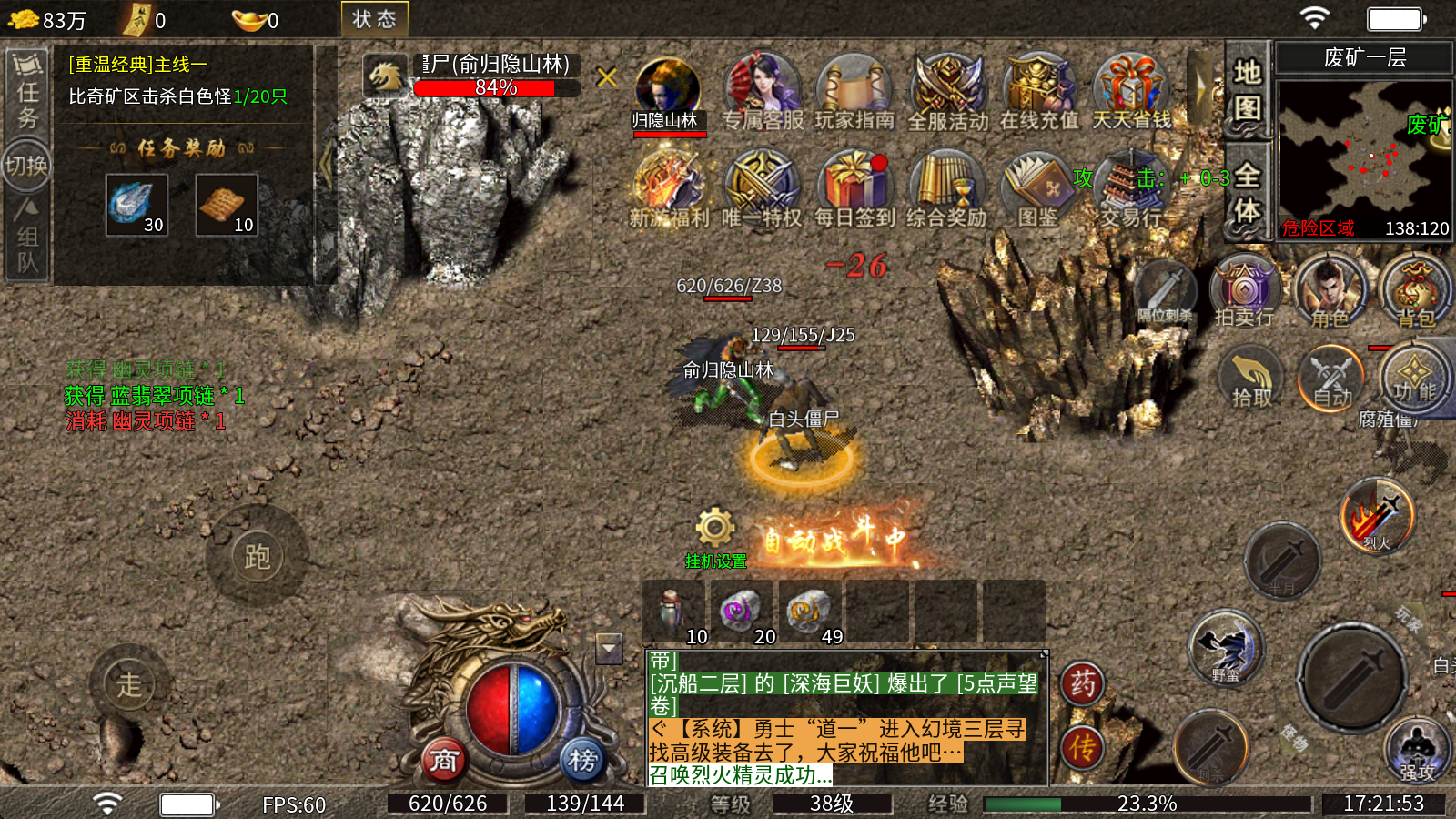 1、上线领取《新游福利》里面的“运7武器和运2吸血项链”,跟随主线任务轻轻松松达到40级左右。