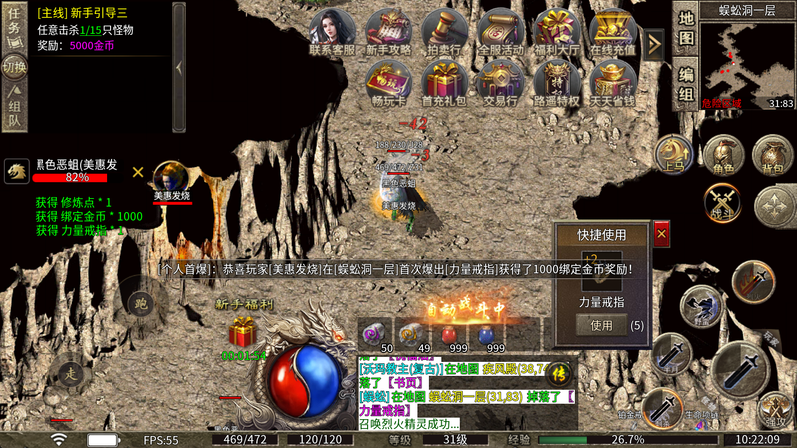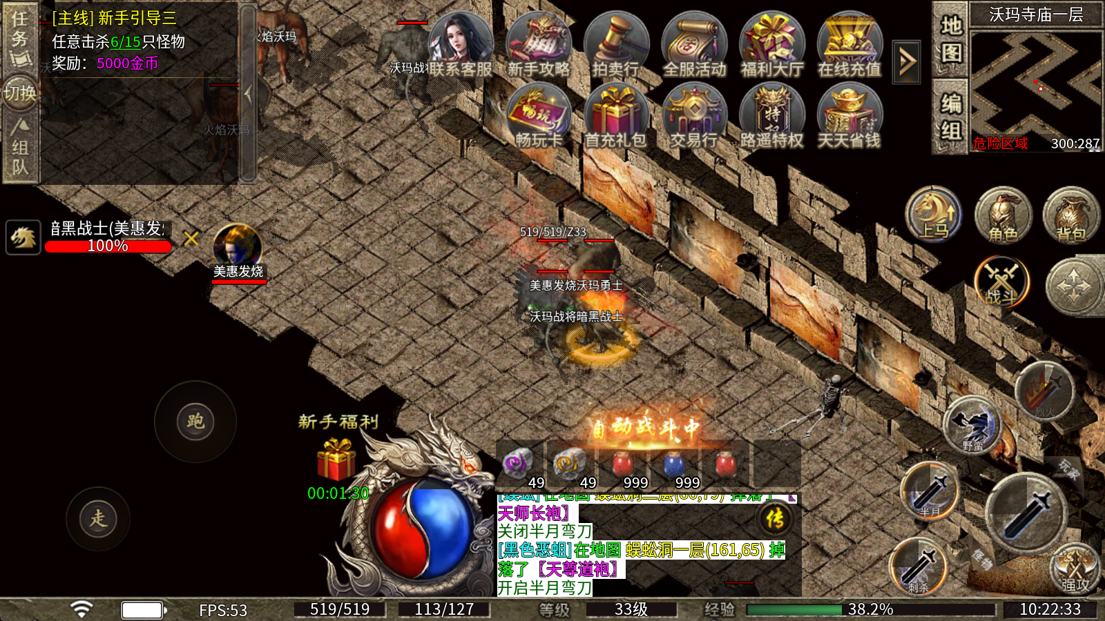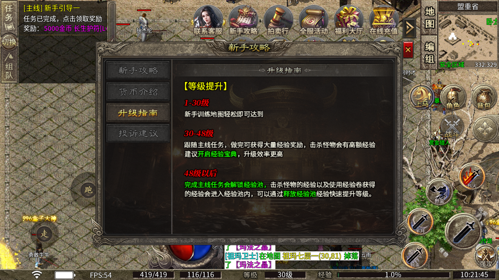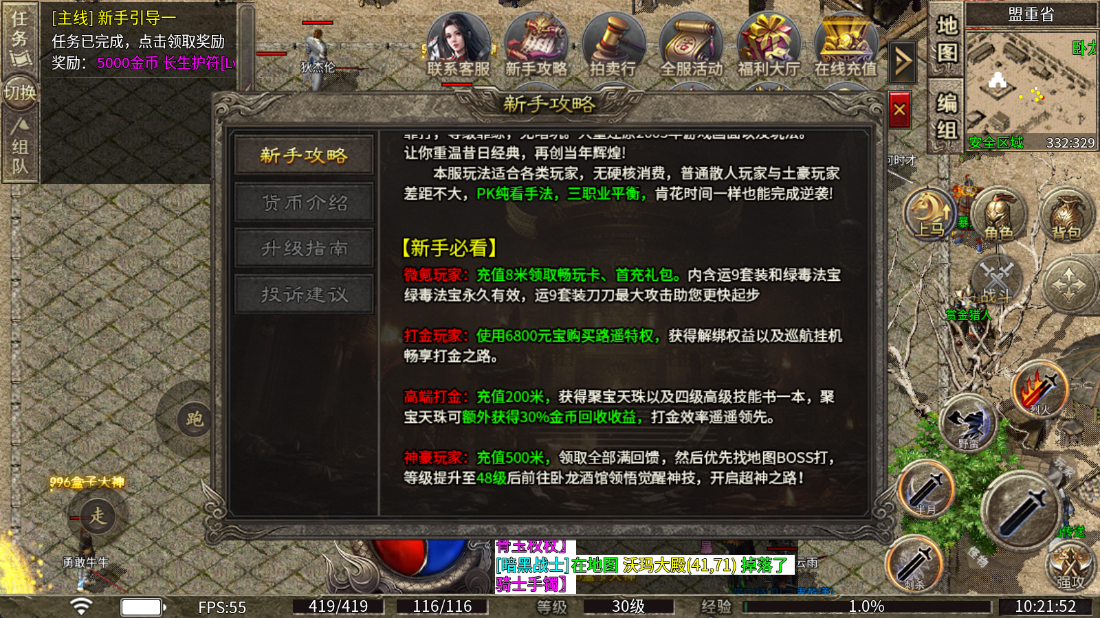 4、神豪玩家:充值500米,领取全部满回馈,然后优先找地图BOSS打,等级提升至48级后前往卧龙酒馆领悟觉醒神技,开启超神之路!