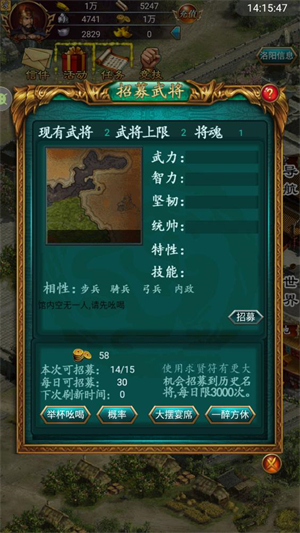 6、武将招募系统每日提供30次免费招募机会,分别在12点和0点各刷新15次。免费招募同样有机会获得紫色品质武将。若暂时未招募到名将,可先选择属性较为优秀的白色武将过渡使用;待主公等级提升至18级时,通过领取任务奖励或消耗将魂在商城购买技能书,即可为主将或白将装配技能,白色武将也能拥有紫色武将的技能效果。此外,通过攻打匪城、在城内城墙处修筑工事、挑战副本、在王宫进行武将训练或使用经验书等方式,均可提升武将等级。