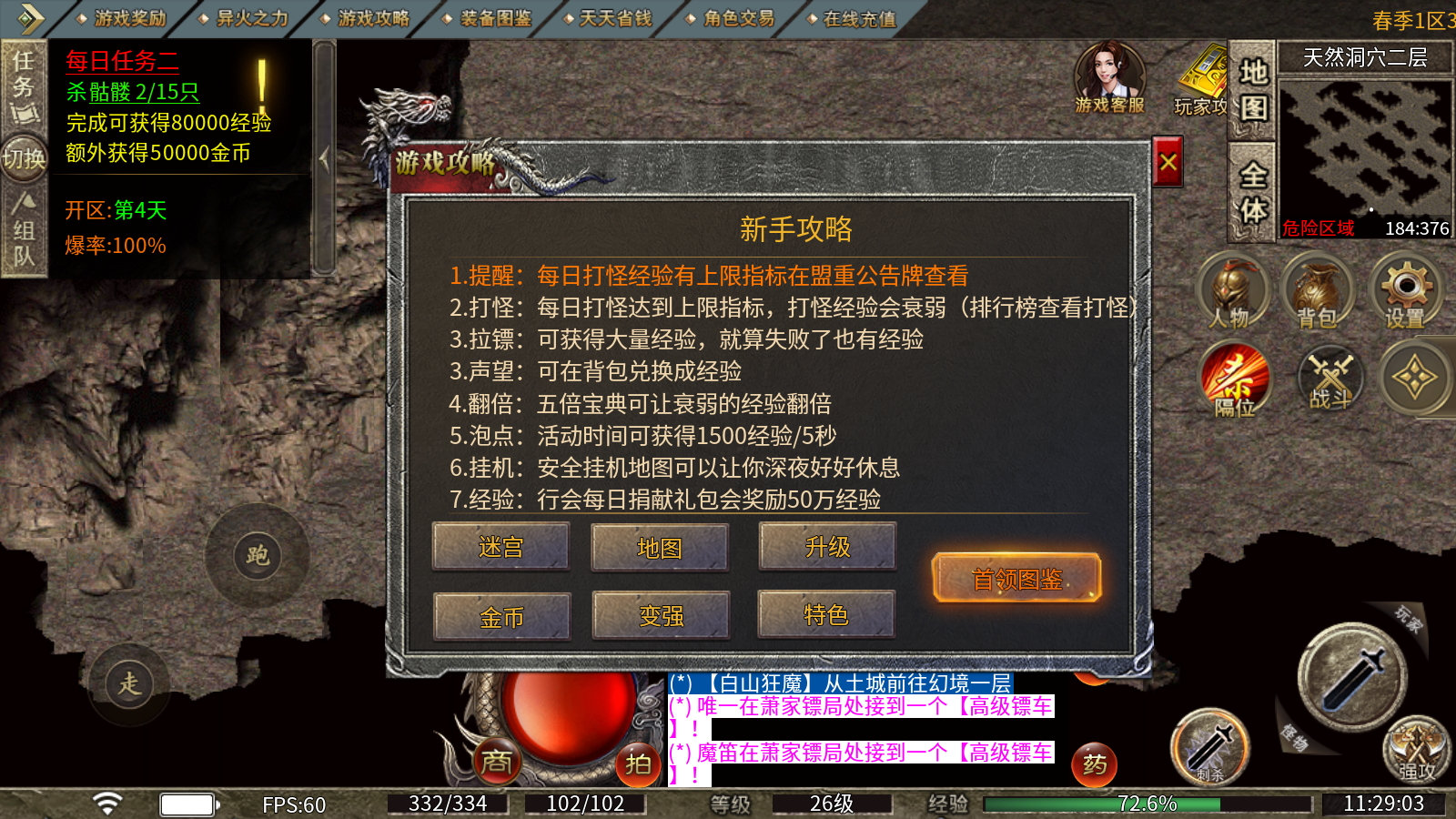 1、提醒:每日打怪经验有上限指标在盟重公告牌查看。