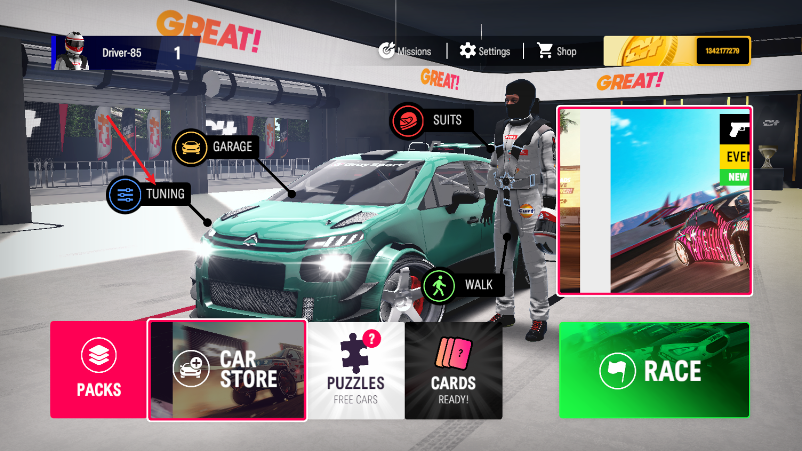 在节日专区自在畅游,在明媚阳光下精心调校你的爱车,然后一路驰骋,冲过80个充满挑战与刺激的职业关卡。