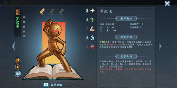 4、前期性价比不错的低费武学,目前我觉得有赵氏长拳、无相功法、纯阳护体、段氏五步拳和罗汉拳,罗汉拳最好单独放一个区域,或者和辅助类武学放在一块儿。