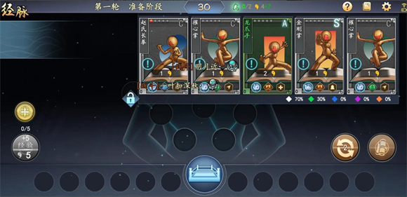 3界面左下角设有经脉等级提升功能,每提升一级就能增加一个出战卡牌的名额。提升经脉经验需消耗右上角的玉资源,每消耗五颗玉可增加五点经验值,例如原本显示0/5的经验条,消耗五玉后会变为5/5从而完成升级。此外,每次战斗结束后也会自动累积一定的经脉经验。随着经脉等级的提升,旁边牌堆中不同品质(从低到高依次为白、绿、蓝、紫、金)卡牌的刷新概率也会相应调整。