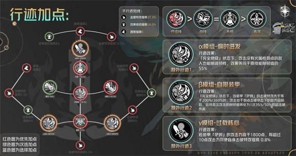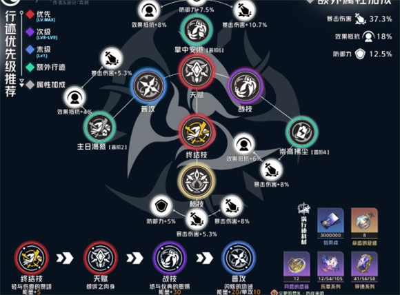 2、技能加点大招=天赋>战技>普攻,大招为我方角色提供30%击破特攻,且在敌方被击破时造成超击破伤害。天赋是有敌方弱点被击破时,开拓者回复能量。可见大招和天赋是开拓者的主要辅助伤害来源。而其他行迹能为开拓者提供37.3%的击破特攻和10%的效果抵抗。