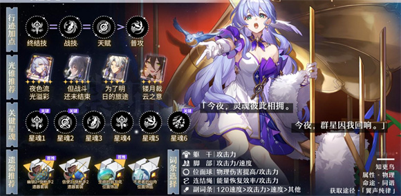 1、知更鸟是一名同谐命途的物理属性角色,是一位能够提供增伤、暴伤、攻击、附加伤害、群体行动提前的辅助角色,并且对追加攻击类队友有额外增益。是一位综合能力优秀且有部分特化方向和输出能力的辅助位。