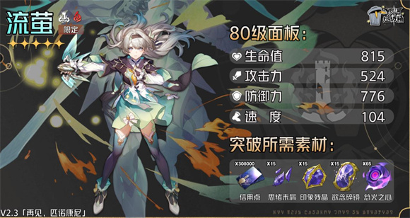 6、总结:在当前版本,流萤完美契合击破流打法所需的一切条件。毁灭命途让她不仅拥有足够强悍的输出,还有着不俗的生存能力。在优势环境下,甚至能和黄泉手腕,说是当前版本最为强力的击破C也不为过。同时,流萤是目前星铁中第一个高速手,在回合制游戏中,高速就代表着行动速度快,可以增加出伤次数,再加上流萤本就不俗的单段伤害,可以在一轮中打出非常高的总伤害,如果说黄泉是靠爆发取胜,那么流萤就是靠速度取胜。不但如此,流萤发动秘技或在【完全燃烧】状态下可以为敌方目标附加火属性弱点,这也大幅增加了流萤的打击面,使她可以跨属性执法。在目前版本来看,流萤可以作为通解使用,不管是大世界、模拟宇宙还是三深渊,流萤都可以发挥出很大作用。由于超击破的出伤体系,击破C不吃攻击力和双暴,因此流茧门槛极低,不穿装备都可以满星深渊,遗器点满则是更为锦上添花。