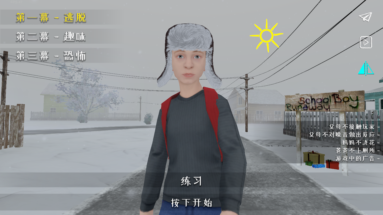逃跑男孩的中文版来啦!这是一款采用3D第一人称视角打造的逃生游戏,而且是经过汉化的全新版本,能让你体验到更丝滑顺畅的解谜过程!在游戏里,你扮演的是一个不爱学习的学生,因为这个原因,父母常常会惩罚你,于是你下定决心要逃出家门。你得格外谨慎地搜寻各种物品,以此来规划你的逃生方案,同时还要时刻留意父母的动向——他们可是会察觉到被打开的柜子和门的,要是被发现了,那后果可就严重啦!