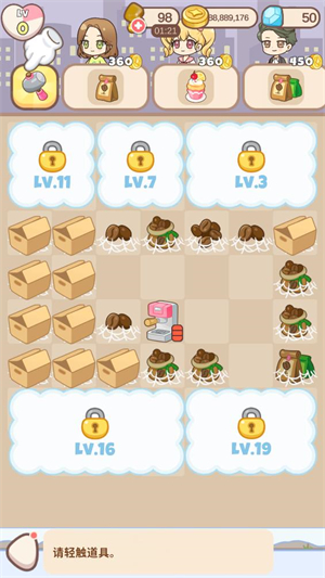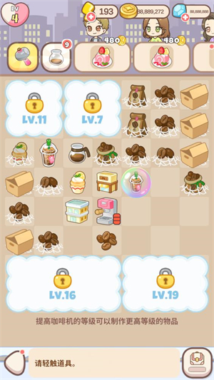 2、点击咖啡机可以获得各种物品,两个相同的物品可以合成更高的等级。