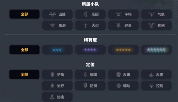 1游戏内角色的稀有度划分为6星、5星、4星、3星四个等级,通常稀有度越高,角色的强度也就越出色,对应的获取难度也会更大,主要获取途径为抽卡以及完成新手阶段的任务。除了稀有度的区分外,每个角色还具备独特的定位属性,具体包括:护盾型、输出型、反击型、反伤型、治疗型、防御型、辅助型、控制型与协击型。