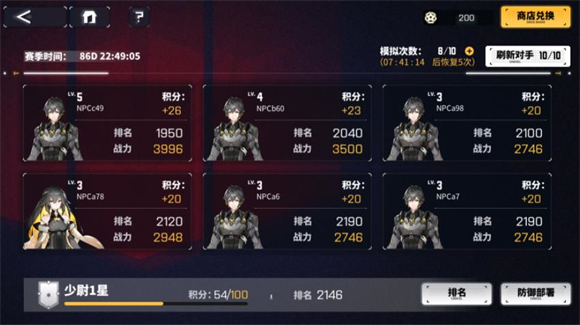5每位参与者每日都有固定的演练机会,发起与其他用户的对抗需要消耗这类机会。对抗场景中的队伍智能配置和常规战斗的配置互不影响,而且主动出击的阵容和防守端的布局也采用各自独立的智能设置规则。每次发起对抗后,无论结果如何都会得到一定的点数和演练凭证,但未获胜时的收益会有所减少,中途退出则无法获取任何收益。对抗后的点数收益与双方当前的位次差距相关,挑战位次高于自己的对手能得到更多点数。积累的点数将用于提升参与者的等级和位次。当一个周期结束时,系统会依据参与者的最终等级发放相应的奖励。