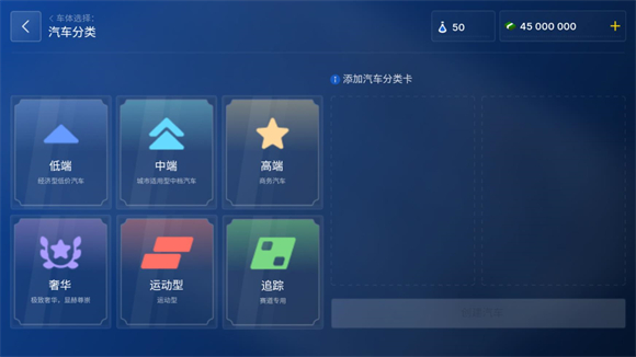 4、选好后点击创建汽车,此时可以选择汽车的种类,是高端大气上档次,还是低调奢华有内涵都可以。