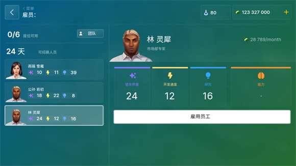 11、在主界面点击下方最后一个小人按钮可以雇佣不同的员工,每一个员工的属性都是不同的。
