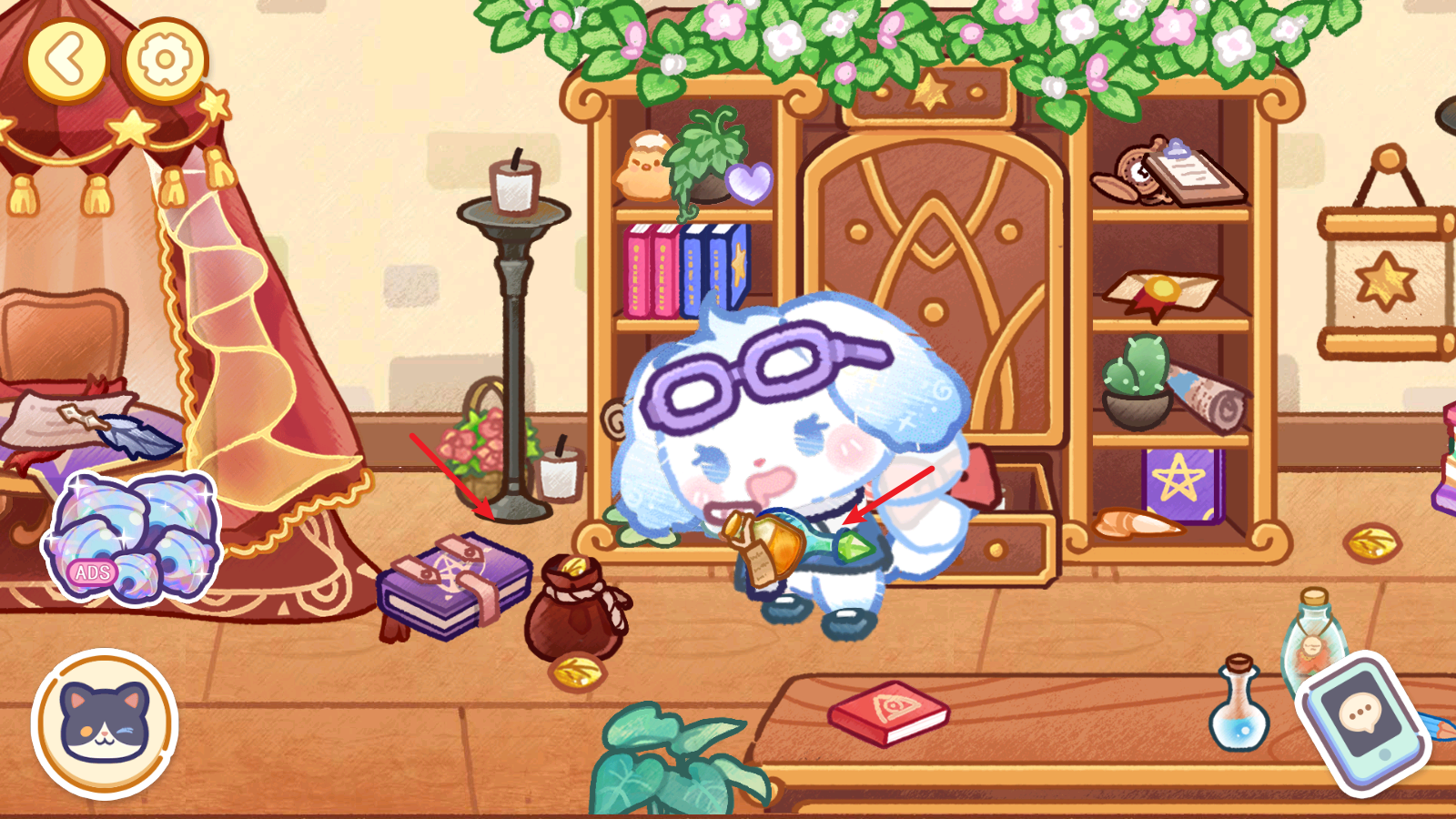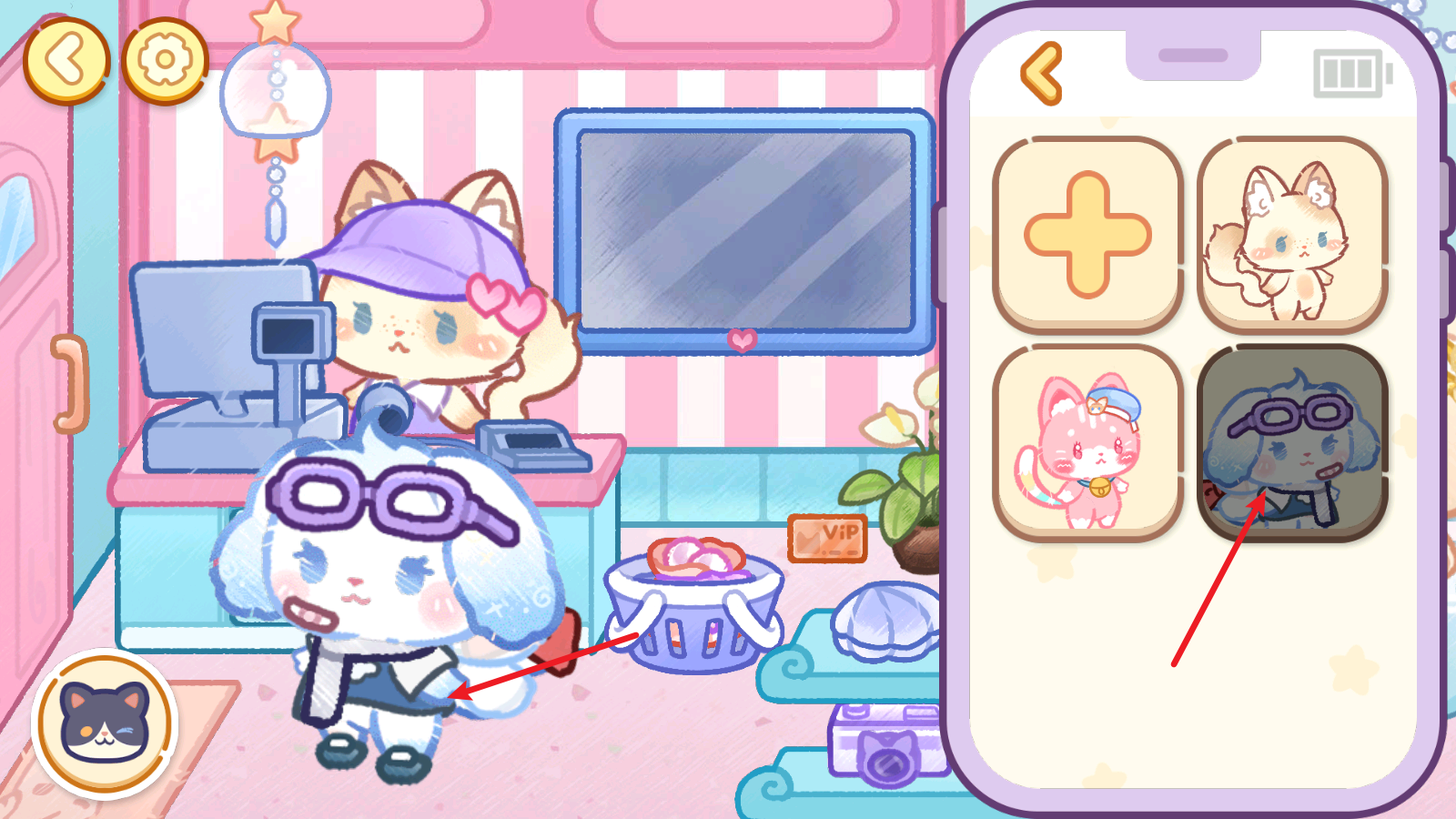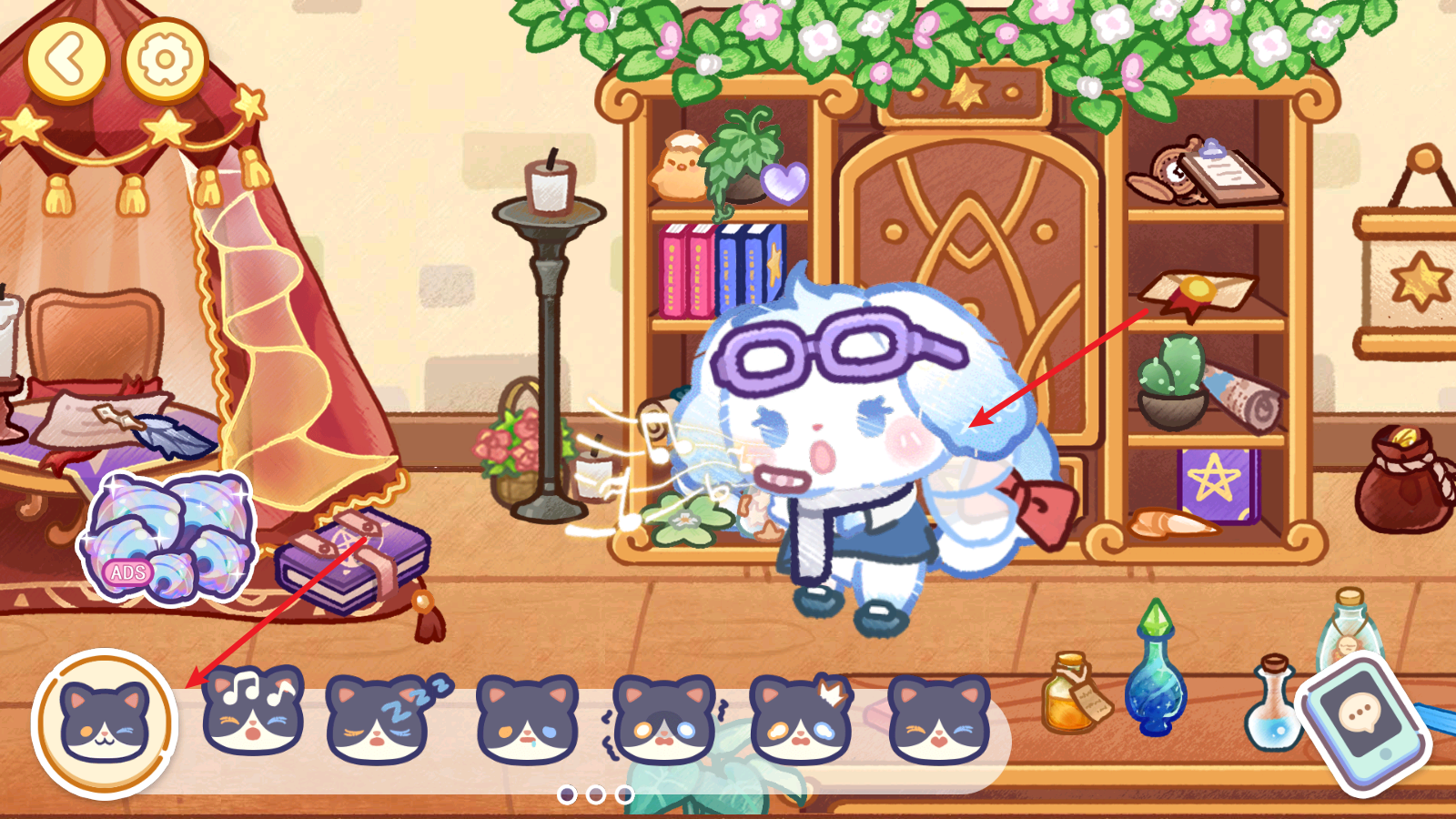 2、场景中可以加入自己的角色,点击左下角的猫咪头像,就可以让角色做出各种表情。