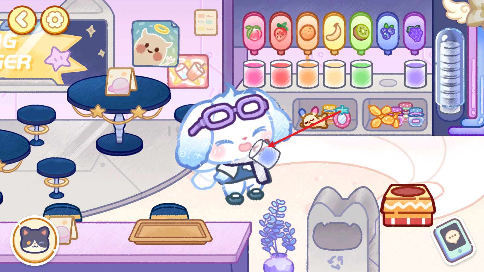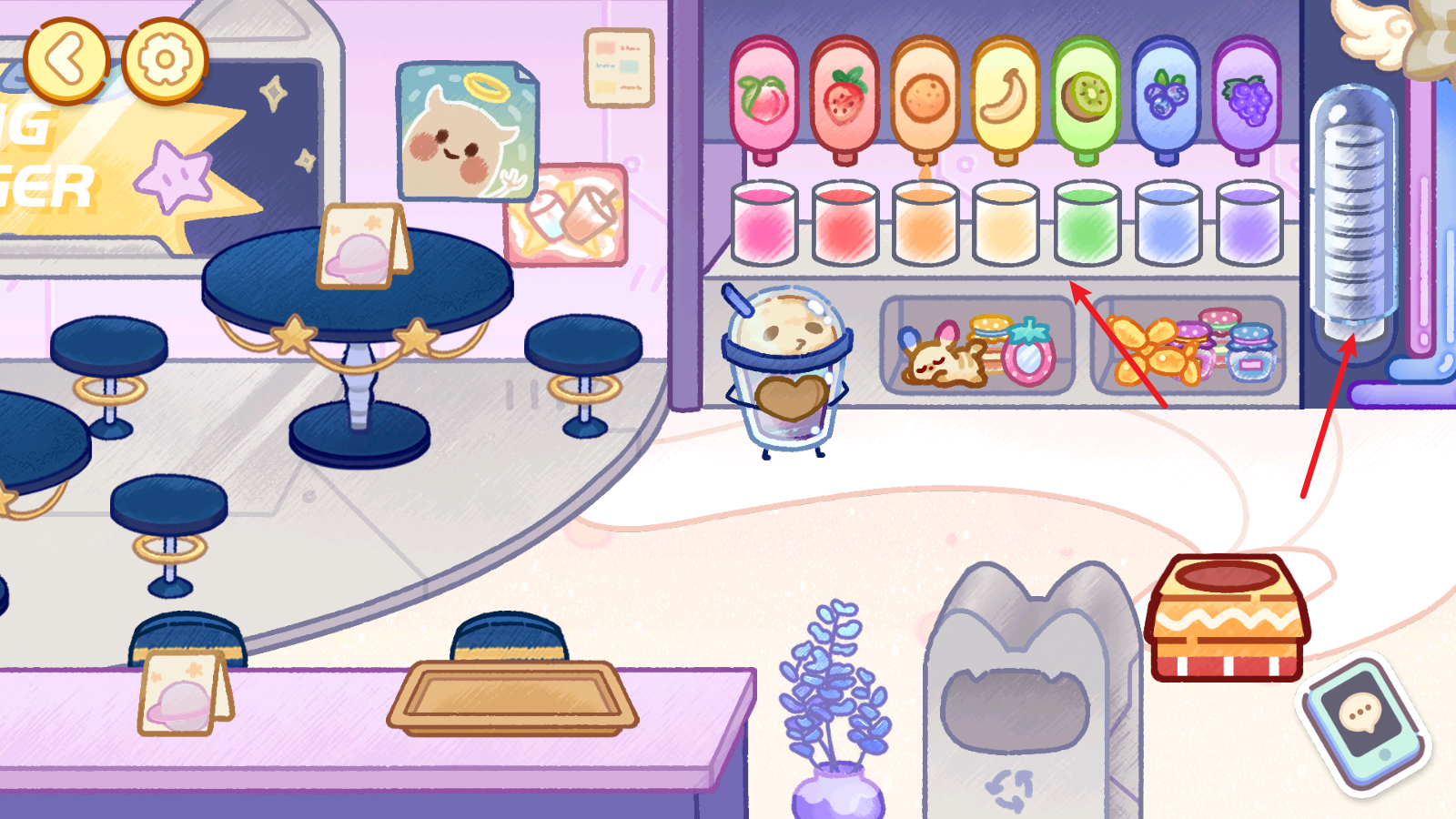 4、接着我们还能去往其他的场景,例如饮品店,我们可以拿出多个杯子,装入五颜六色的饮料。