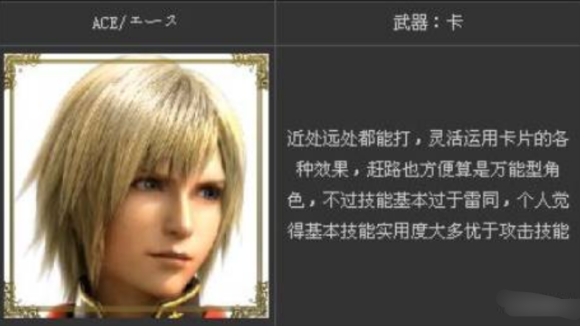 上手很快的角色,远攻进攻都很强大。机动性强,闪避时候瞬移是无敌状态。可惜血少防御力低。魔法尚可,MP量一般,雷属性较高。总体是易学易用多闪避的角色。