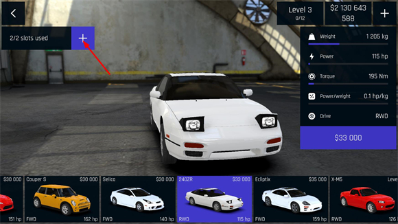 4若遇到无法购买车辆的情况,可通过点击左侧的加号按钮来增加车库的容纳空间,待新的车位解锁后,就能继续进行车辆购买操作了。