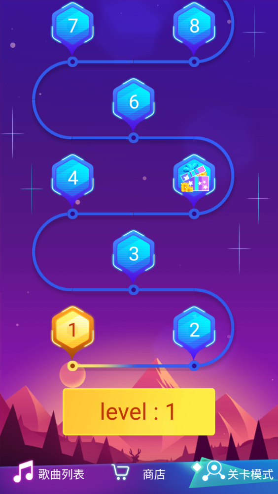 8、除了自由选取歌曲的玩法外,还有趣味的闯关模式哦。