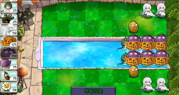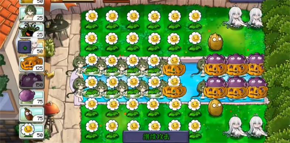 3、摆好阵容后就可以开始了,需要注意的是第二波就需要在中路河道种上海菜和南瓜,因为第二波之后会有偷袭,然后就是补充土豆坚果和大蒜,最好每一波结束就补充。