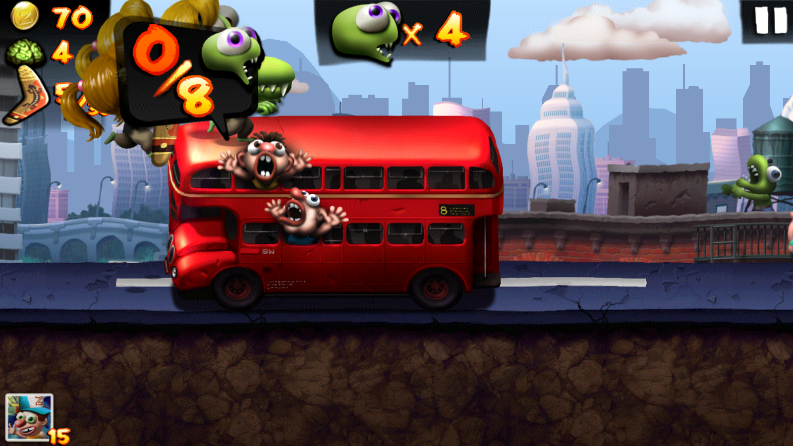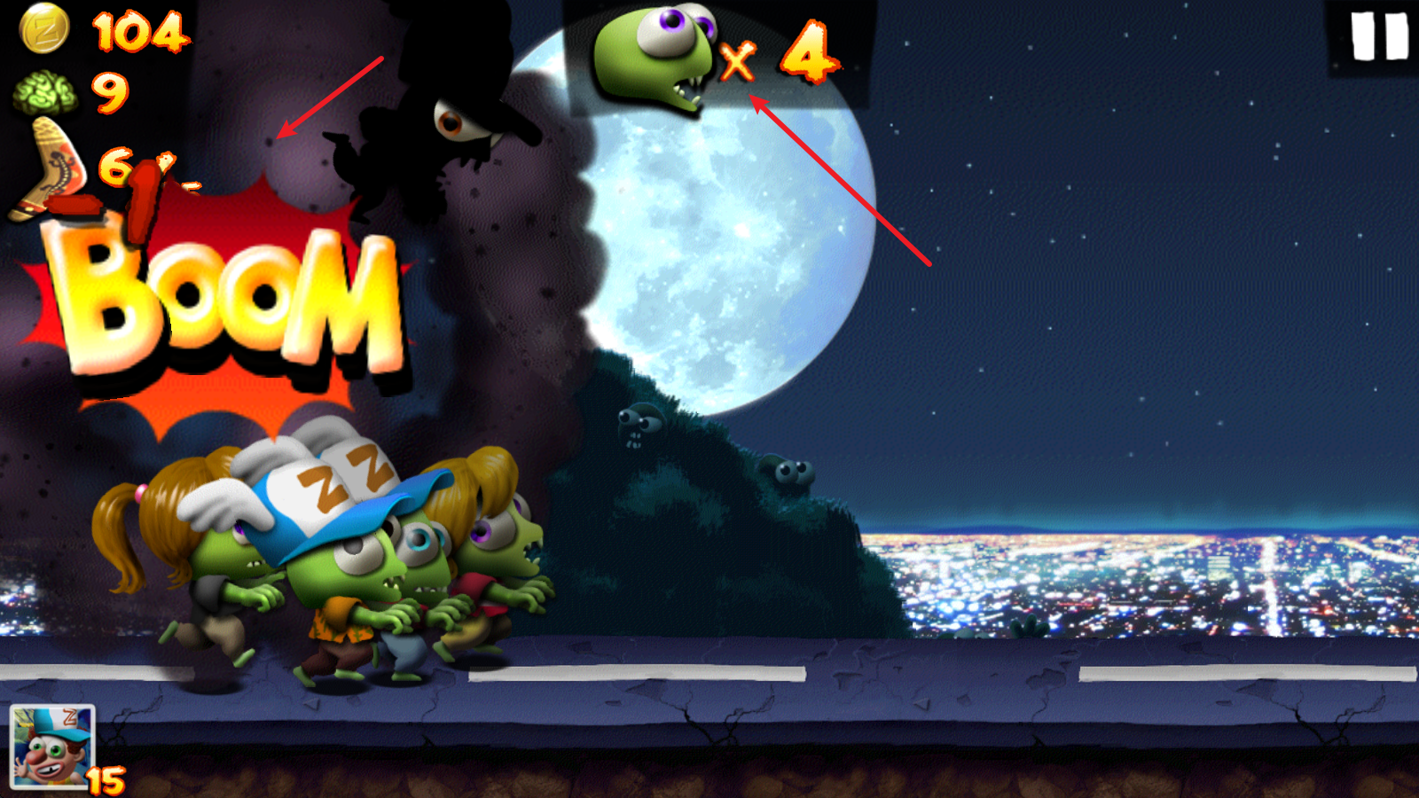 3、除了拦路的人类外,还有这样带有数字的载具,需要对应数量的僵尸才能推翻,不然就只能跳跃过去。