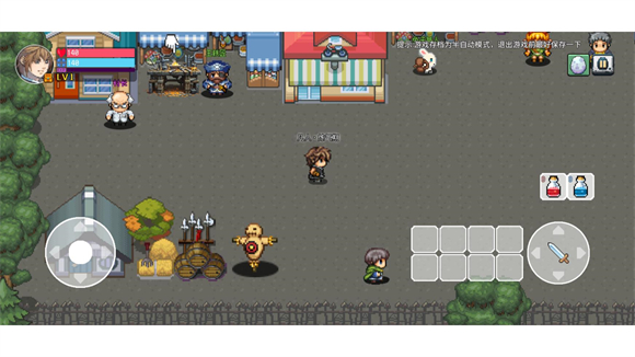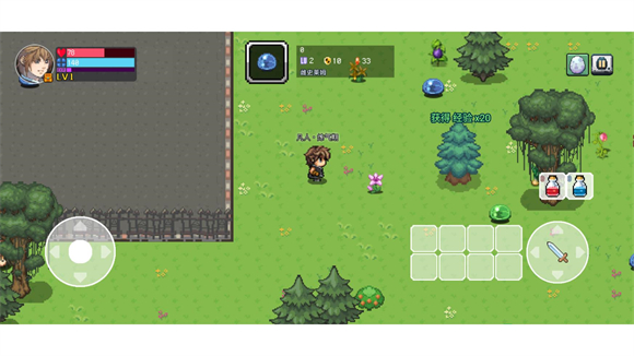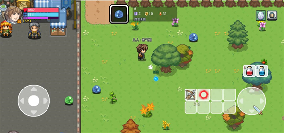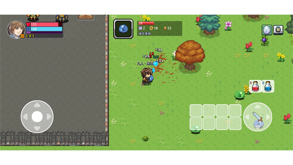 3、游戏界面左侧用于操控角色移动,右侧则分布着物品栏、攻击按钮以及回复药剂。