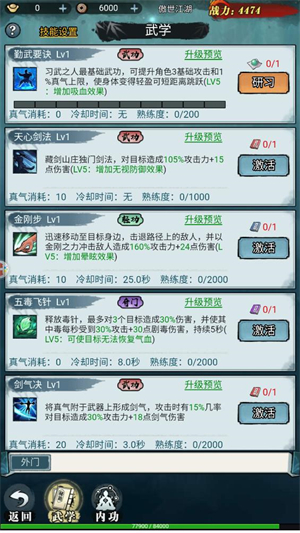 3、点击武学按钮可学习各类招式,每个招式都需收集对应的功法方能解锁学习。