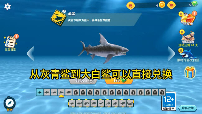 国服:从灰青鲨到大白鲨都可以直接兑换,都后面的鲨鱼不能直接兑换,必须获得上一条鲨鱼才能开始兑换下一条鲨鱼。不仅如此,下面的特殊鲨鱼有的只能通过活动来获得。