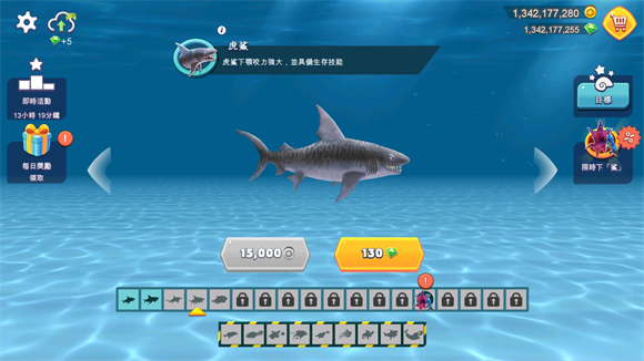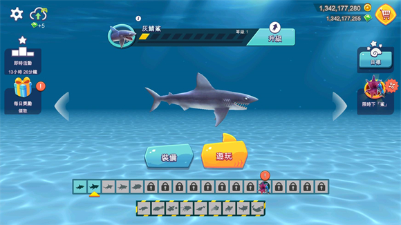 1给刚开始玩的玩家一些关于解锁鲨鱼的建议,推荐按这样的顺序来:先解锁礁鲨,接着是灰鲨,然后是锤鲨,再之后是虎鲨、白鲨、电鲨,最后解锁黑锤鲨。
