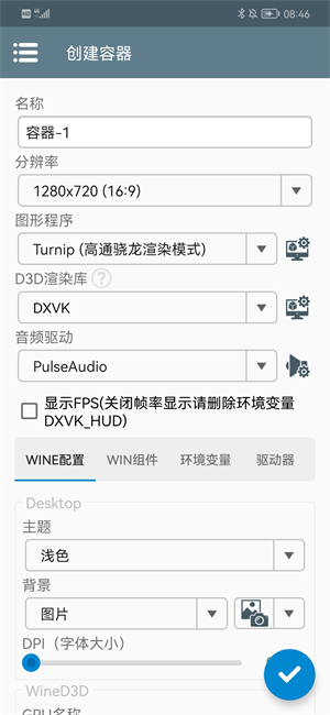 2安装结束后,点击界面右上角的加号按钮新建容器,接着依据自身手机的硬件配置情况,对相关参数的属性进行适配性调整。