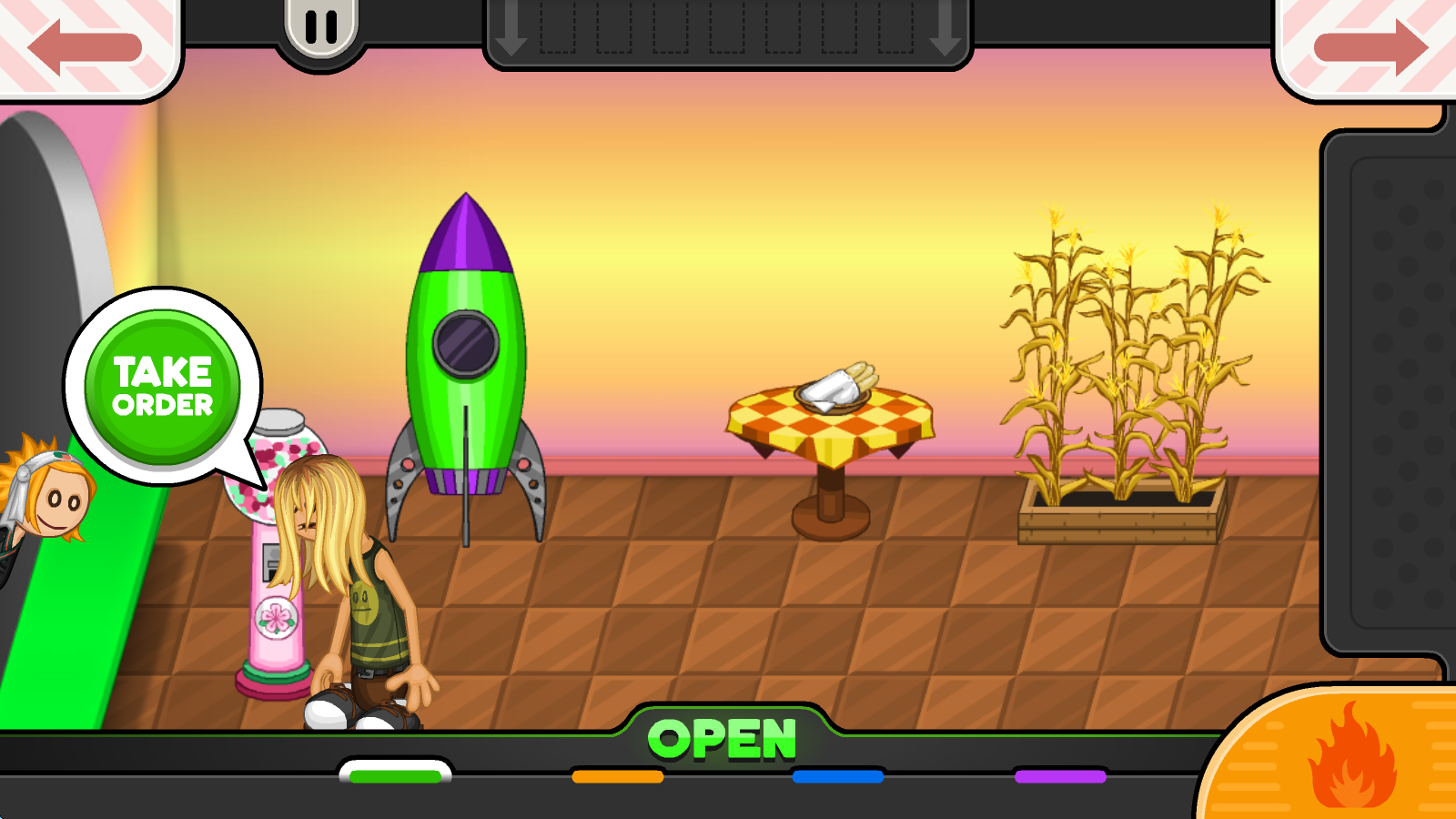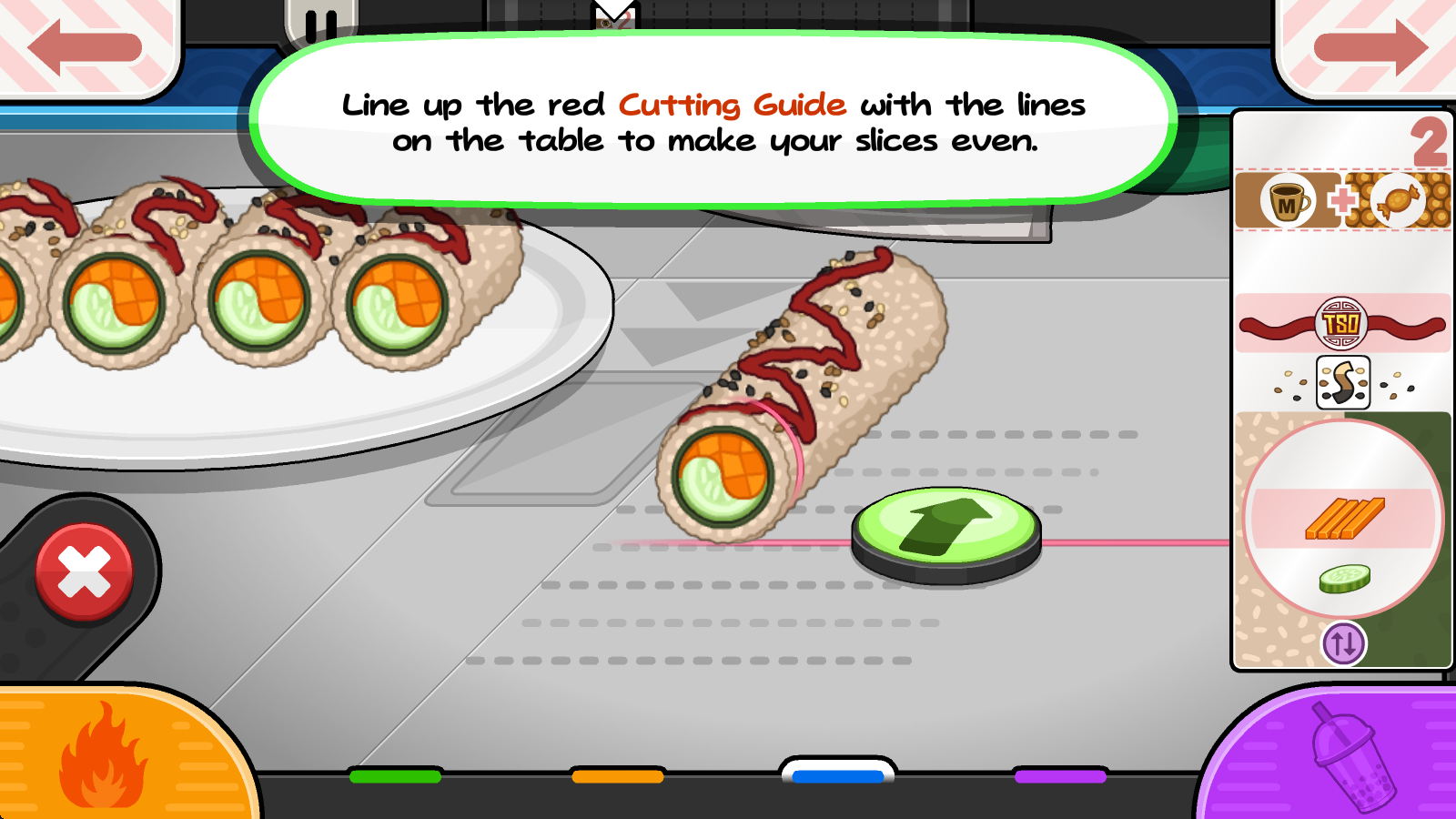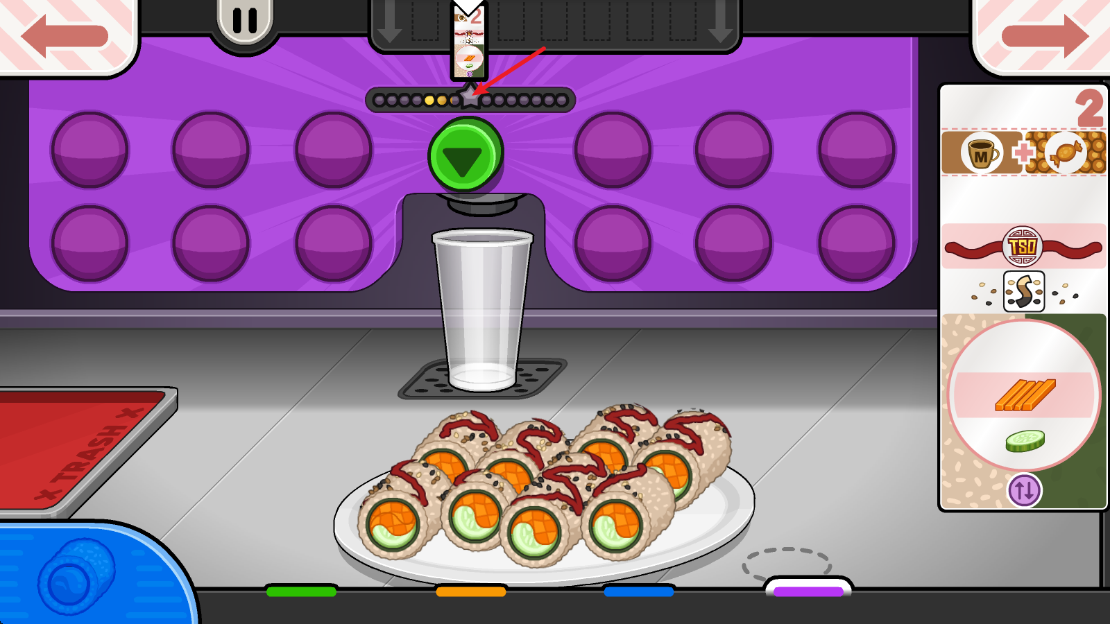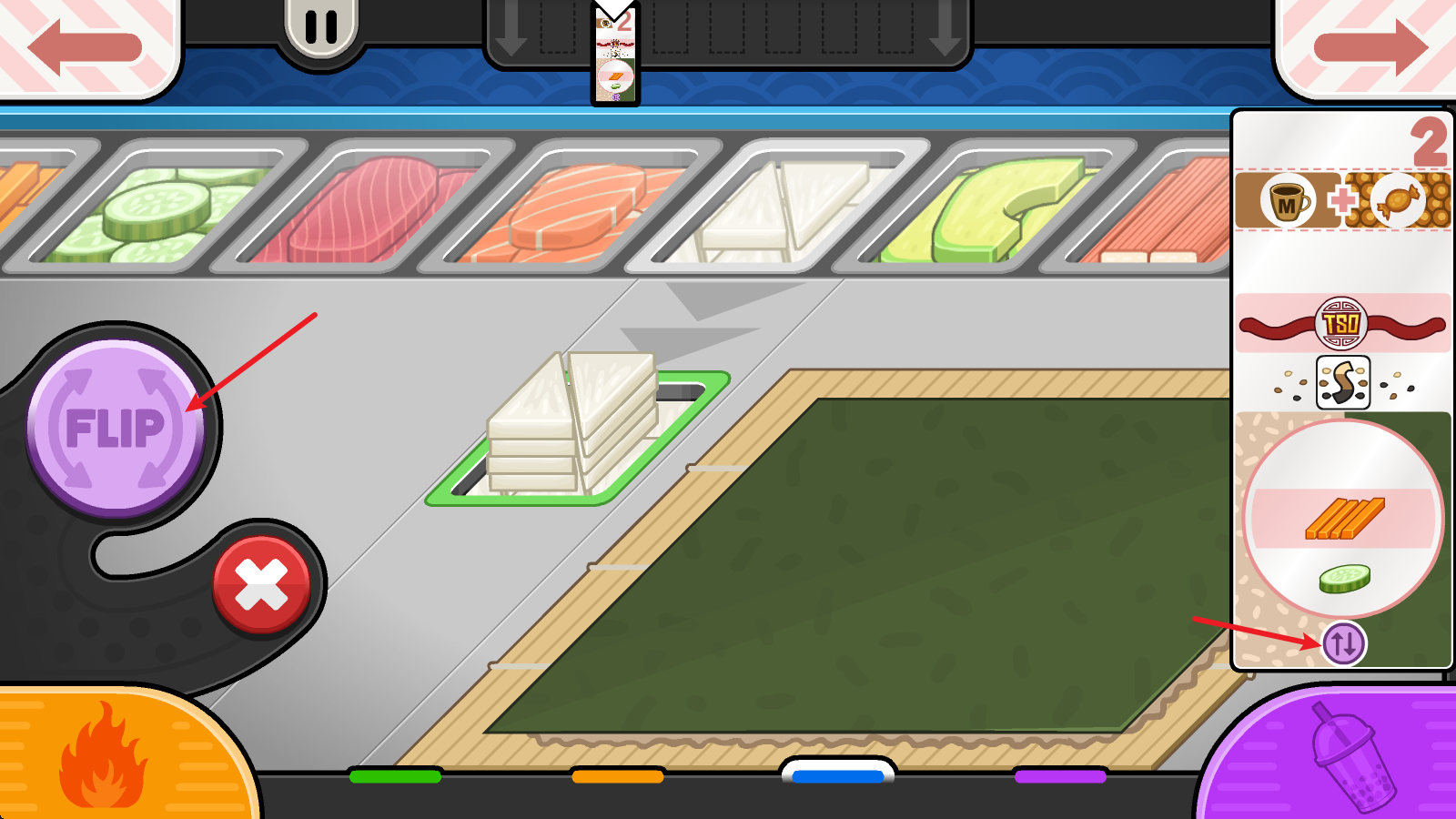 2接下来是添加配料的环节,此时要留意顾客的具体需求。若界面出现紫色箭头提示,就需要点击左侧的FLIP按钮,将海苔面翻转朝上后再进行配料的添加操作。