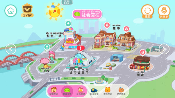 2、进入游戏,可以看到游戏为玩家准备了很多的游玩主题,如家庭生活、职业认知、学校生活、艺术创造等。