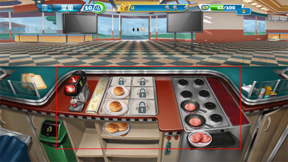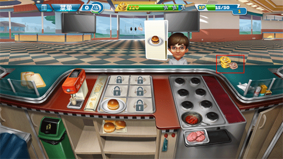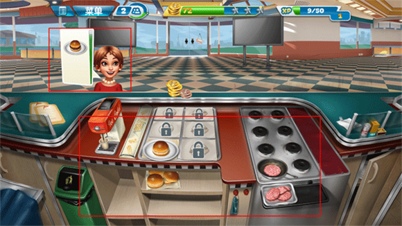 1、选择关卡进入游戏,玩家需根据客人的口味,选择汉堡包,然后将牛排放入到汉堡包里面,最后将食物递给顾客。