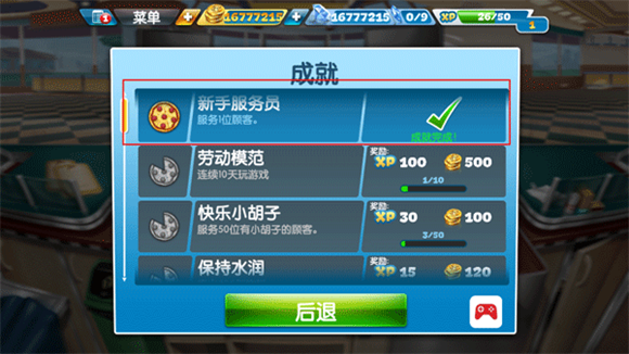 5、然后新手服务员成绩已经达成,接下来的成就就是劳动模范,需要连续10天玩游戏才能达成。