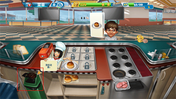 3、当你制作的牛排已经烤焦了,可以点击牛排并将它移动到垃圾桶里面。你需要完成关卡开头给与你的目标指数,这样就可以达成今天的业绩要求了。