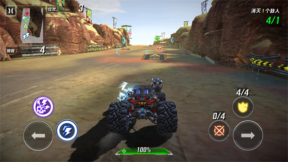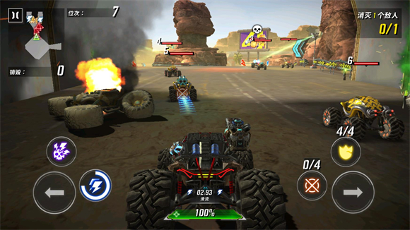 7、进入关卡后左右箭筒控制车辆的转向,蓝色的按钮是冲刺,紫色的按钮是终极技能,红色的瞄准是发射导弹,黄色的盾牌是护盾,这些按钮点击就可以使用。
