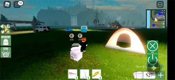 2、上方是背包按钮可查看当前背包中道具种类与数量,下方是商城可以购买各种各样的物品、帐篷、车辆、装备。