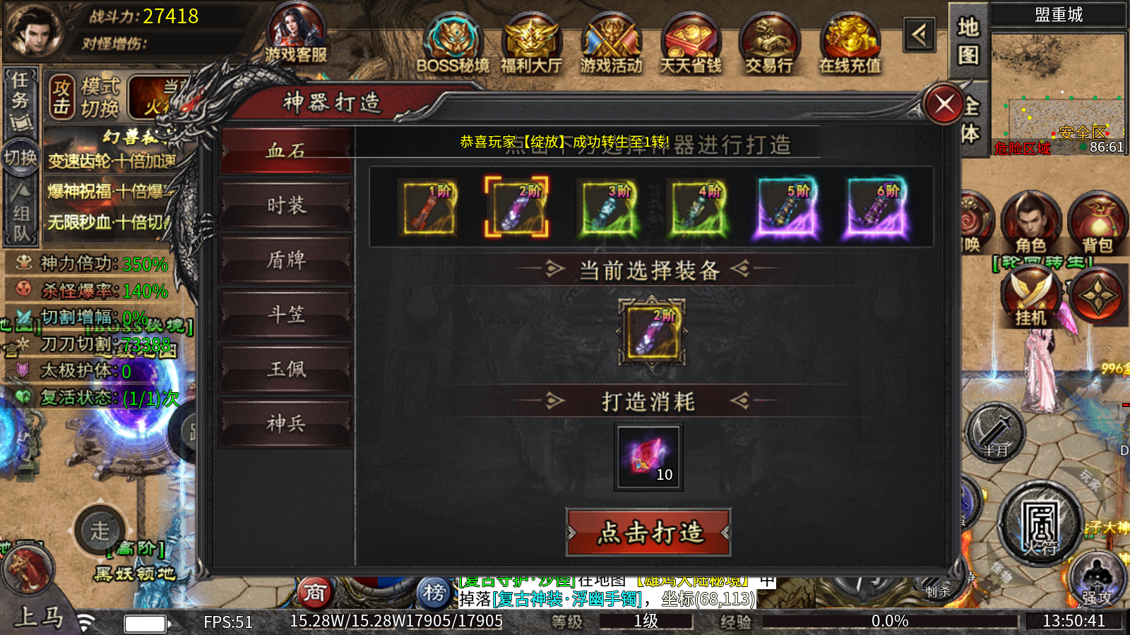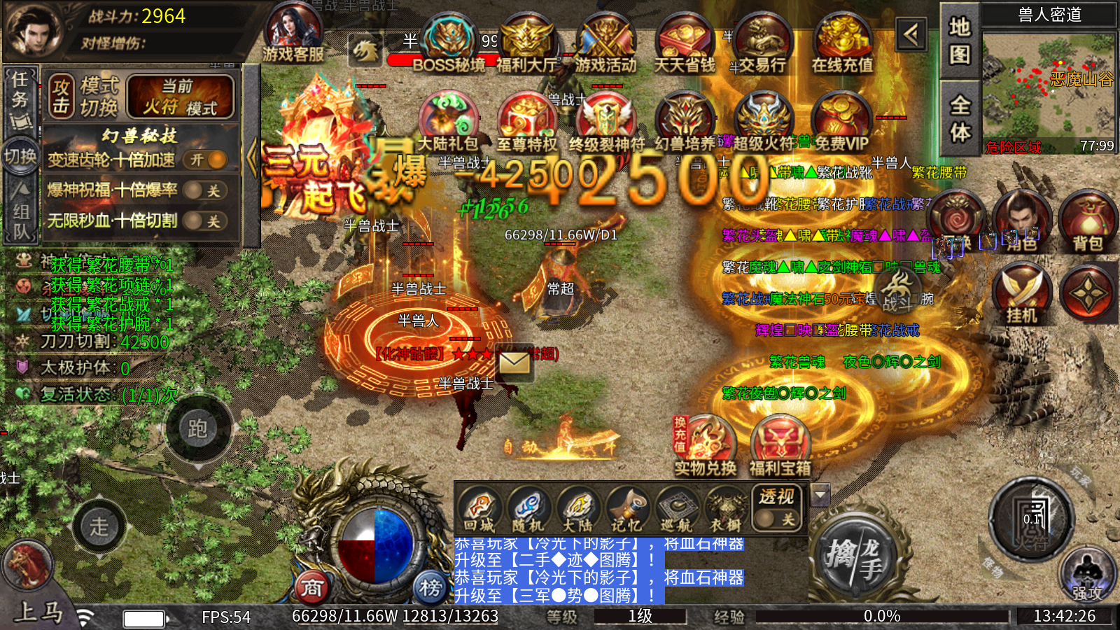 3、杀怪即可激活免费特权、火符神器,散人必备,提升大量属性,打宝效率加倍成长。