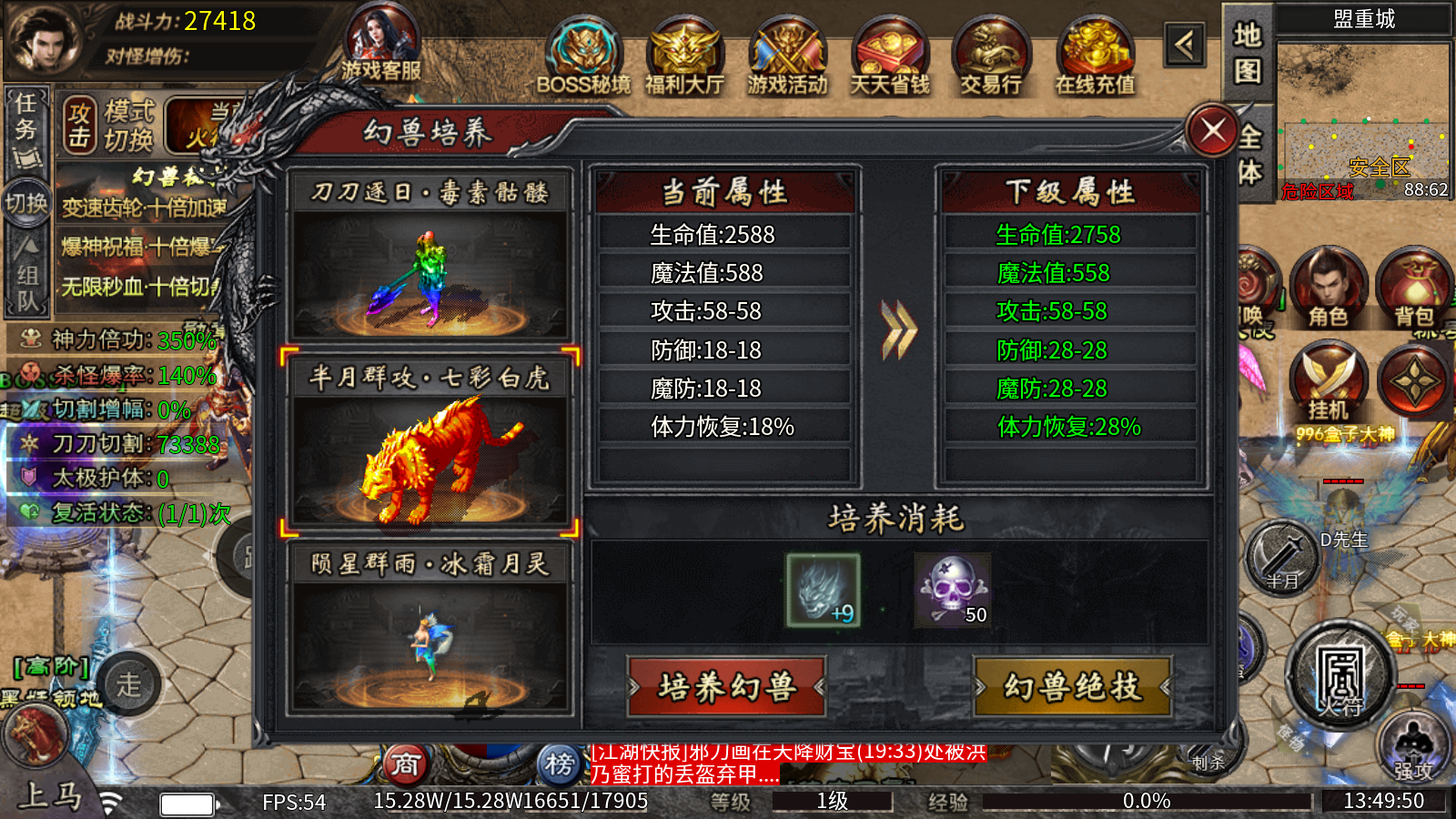 1、《幻兽进阶》:提升宝宝和宝宝进阶,高阶宝宝属性起飞,自带群攻控制,下图杀BOSS必升。
