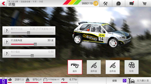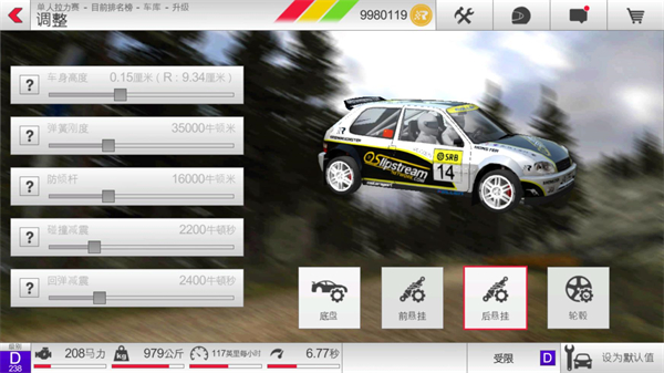 2、悬挂:悬挂包含前悬挂与后悬挂,二者可调节的属性一致。车身高度升高有助于增加弹簧的活动行程,在遇到弹跳或颠簸路况时,车辆更不易发生侧翻。若前车身增高、后车身降低,车辆容易出现转向不足的倾向;反之,前车身降低、后车身增高,则可能带来转向过度的趋势。弹簧刚度设置为前低后高时,车辆的加速度会有所提升;刚度数值越大,悬挂就越硬,此时通过连续凹凸不平的路段会比较困难,因为车身容易弹起,但轮胎的抓地力会增强;而刚度数值越小,悬挂则越软,通过凹凸路面会更轻松,不过抓地力会下降,这种情况下过弯时建议使用手刹辅助。防倾杆的作用可类比为对车辆配重比的调整,它能有效抑制车辆转弯时的侧滑现象;若前悬挂防倾杆数值高、后悬挂数值低,车辆容易出现甩尾;反之,前悬挂数值低、后悬挂数值高,则更容易实现漂移。