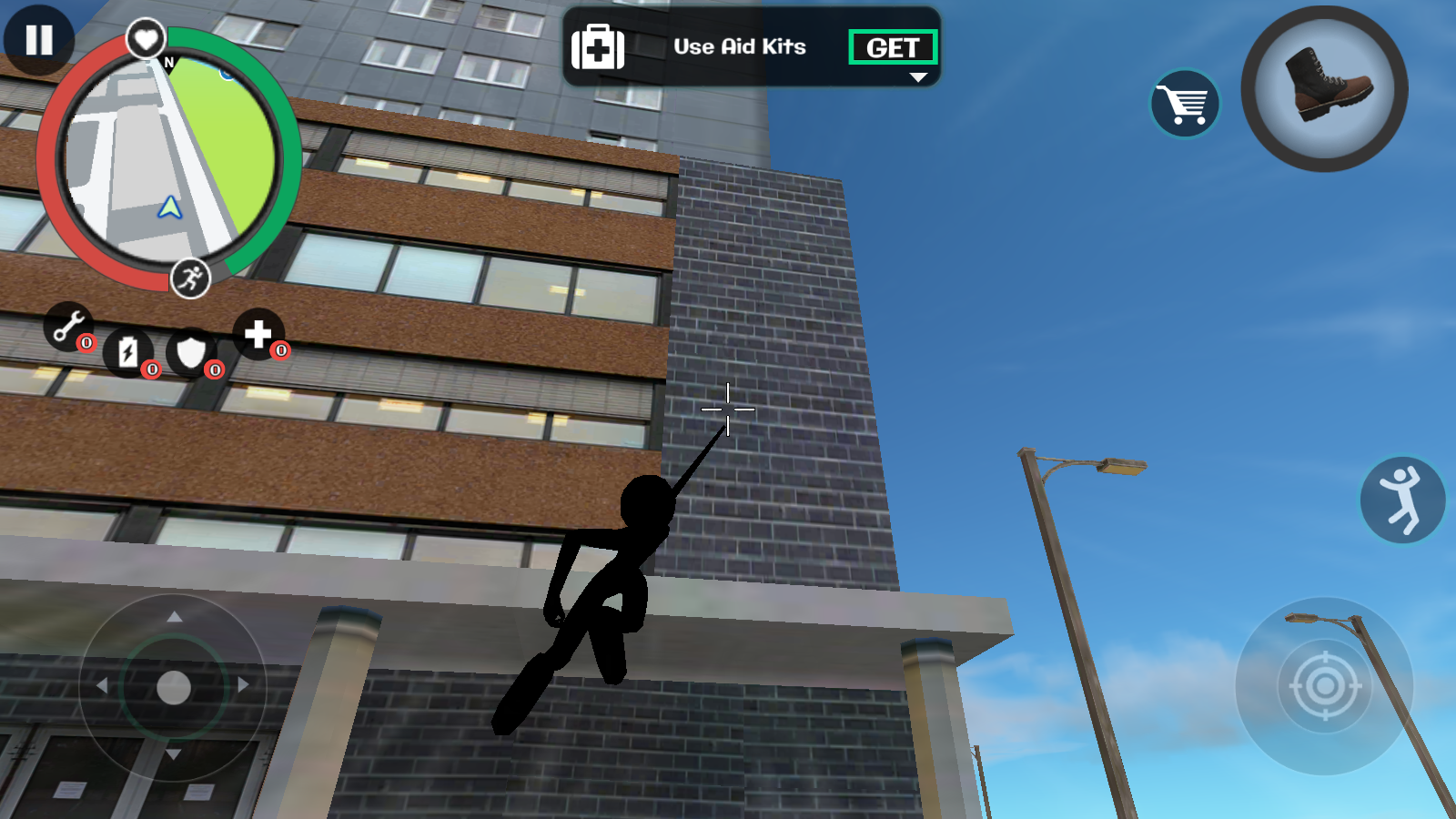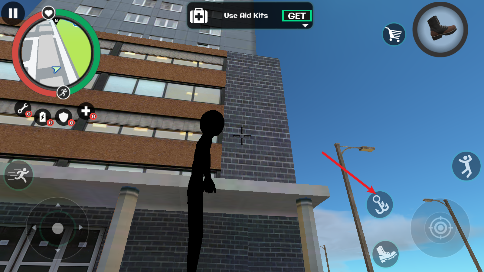 4、对准墙壁后,点击绳索按钮就能发射,向着墙面飞去,这样就能在城市中穿梭了。